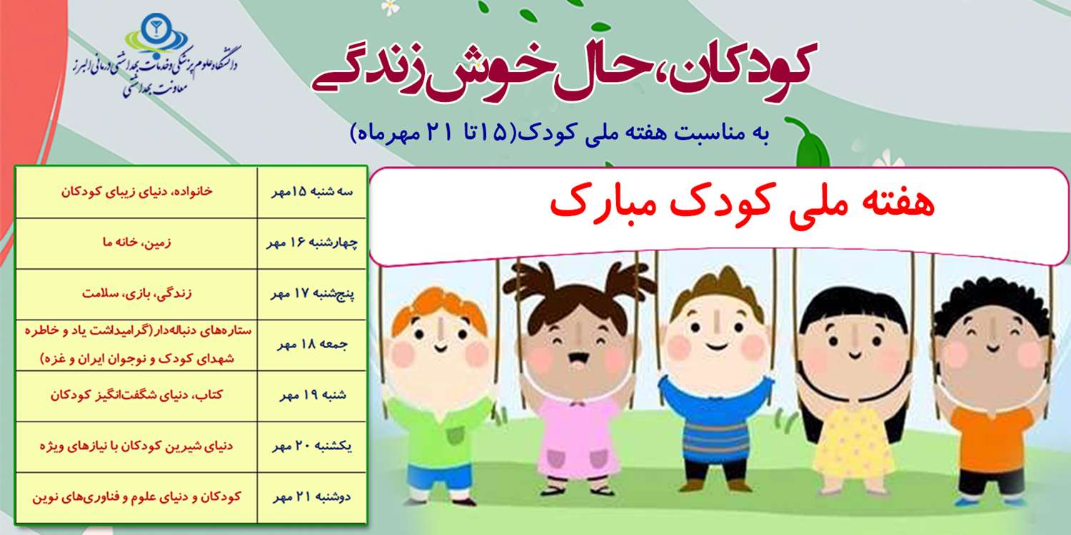 15تا 21 مهر ماه سال جاری با عنوان هفته ملی کودک نامگذاری شده است. هفته ملی کودکان با شعار "کودکان ،حال خوش زندگی" از پانزدهم مهر ماه آغاز میشود.